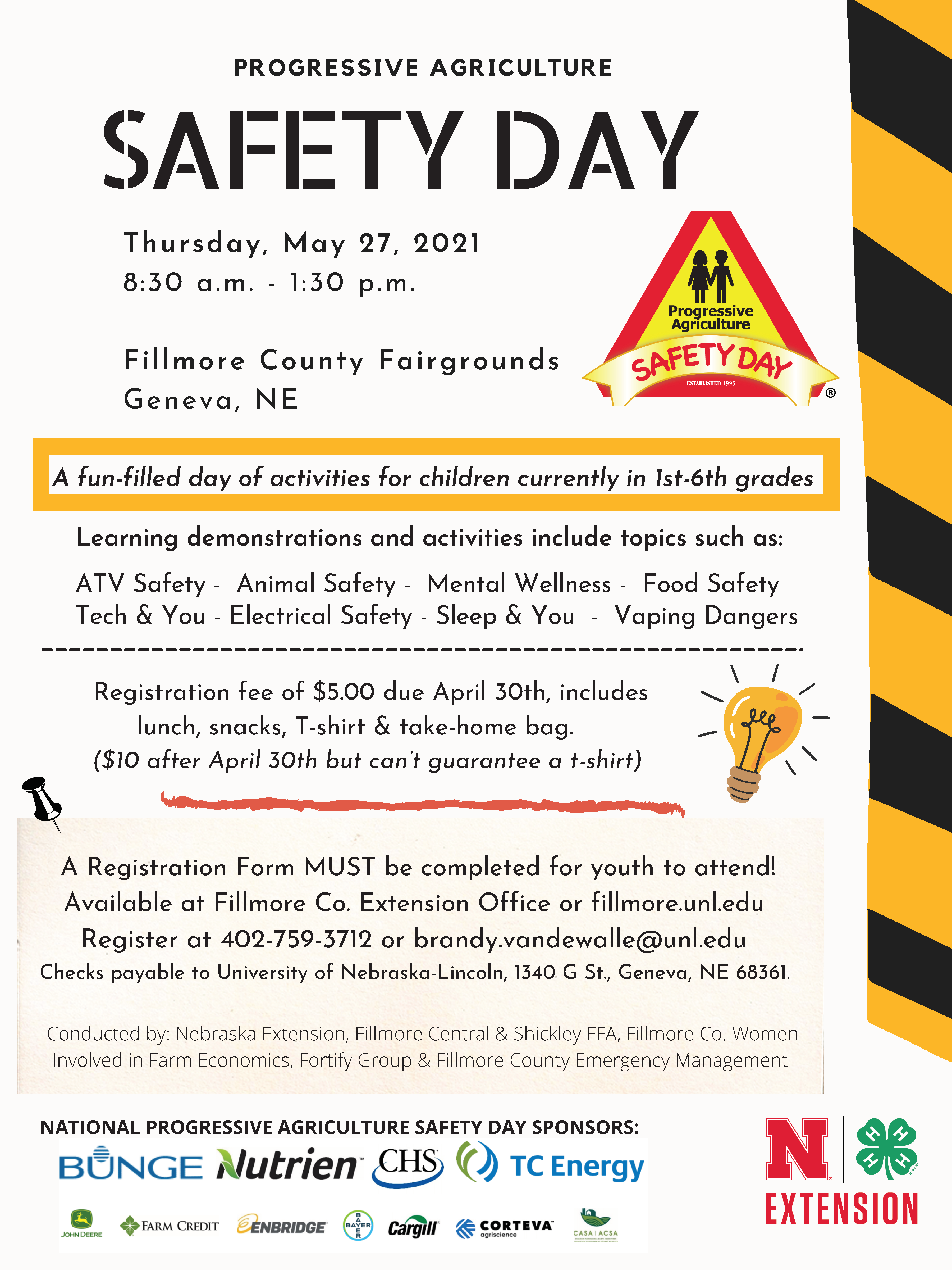 Current 1st through 6th graders are invited to attend Progressive Agriculture Safety Day on Thursday, May 27, 2021 at the Fillmore County Fairgrounds in Geneva, NE. Youth will participate in a variety of events designed to help them be aware of safety in potentially hazardous situations in and around rural and agricultural settings, including electricity, mental wellness, ATV safety, animal safety, food safety, etc. NE Extension hosts this event in Fillmore County, along with Shickley, Fillmore Central, Exeter-Milligan-Friend FFA chapters, 4-H, W.I.F.E. and Fillmore County Emergency Management. Early registration forms and $5 are due April 30th; forms can be downloaded at fillmore.unl.edu. After April 30th, registration is $10/youth. For more info or to register, call 402-759-3712 or email brandy.vandewalle@unl.edu.