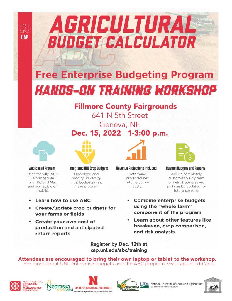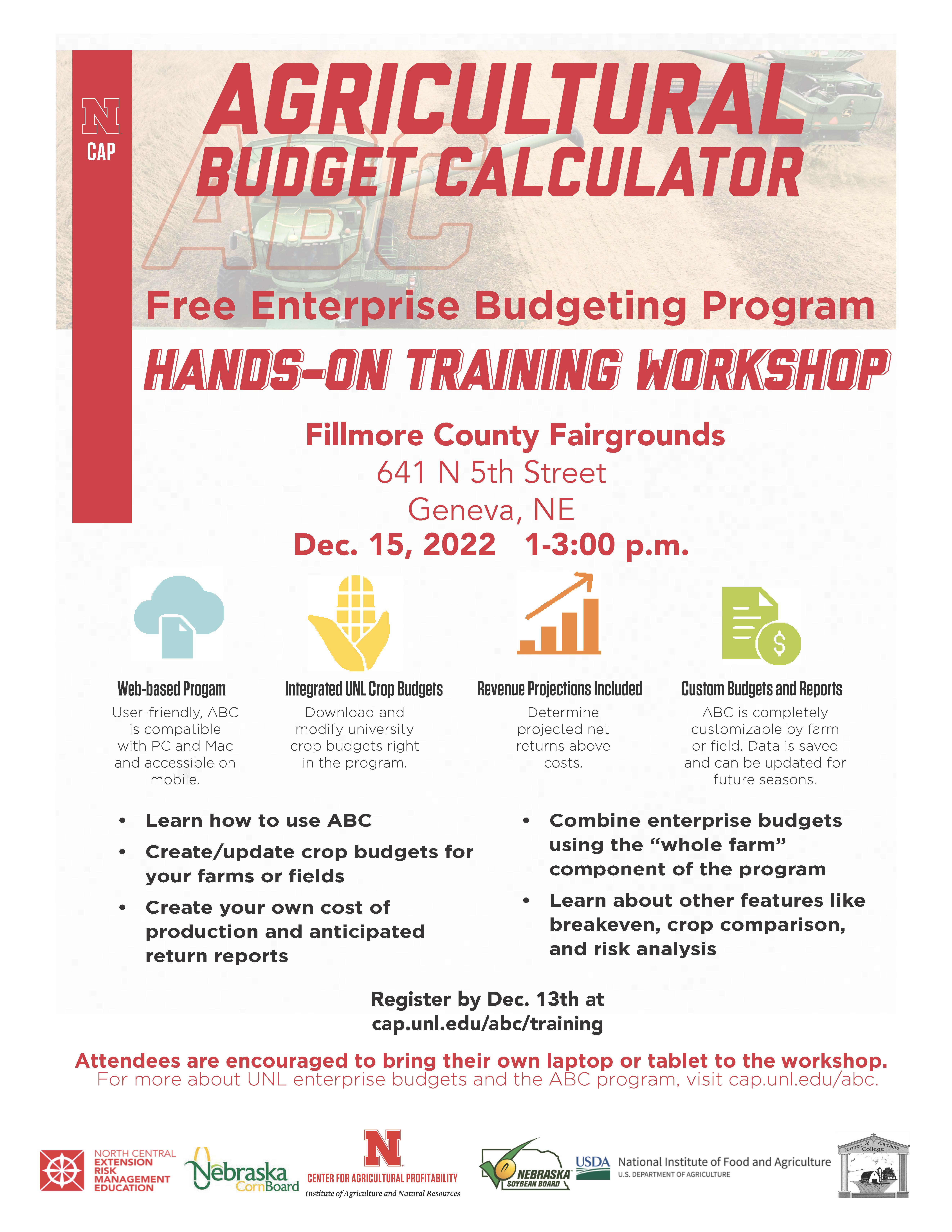 In collaboration with the Farmers & Ranchers College, the University of Nebraska Lincoln’s Center for Agricultural Profitability has scheduled a hands-on workshop from 1:00 to 3:00 p.m. on December 15, 2022, at the Fillmore County Fairgrounds, 641 N 5th Street, Geneva, Nebraska. This program is for ag producers, farm managers, bankers and anyone interested in learning more about utilizing the free online Agricultural Budget Calculator (ABC) for enterprise budgeting.