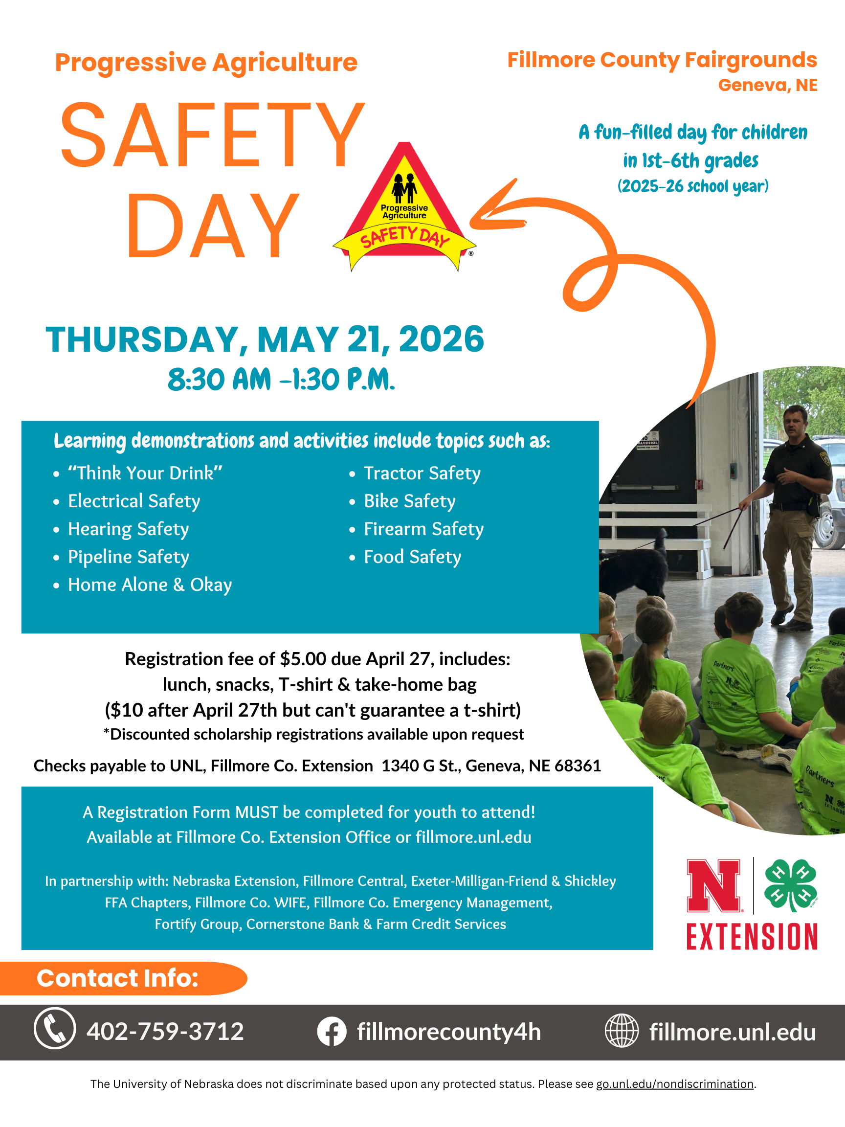 Current 1st through 6th graders are invited to attend Progressive Agriculture Safety Day on Thursday, May 21, 2026 at the Fillmore County Fairgrounds in Geneva, NE. Youth will participate in a variety of events designed to help them be aware of safety in potentially hazardous situations in and around rural and agricultural settings, including electricity, hearing safety, pipeline safety, online safety, bike safety, firearm safety, food safety & healthy lifestyles NE Extension hosts this event in Fillmore County, along with Shickley, Fillmore Central, Exeter-Milligan-Friend FFA chapters, 4-H, W.I.F.E., and Fillmore County Emergency Management. Local sponsors as of the time of this published article include Fortify, Cornerstone Bank and Farm Credit Services.
